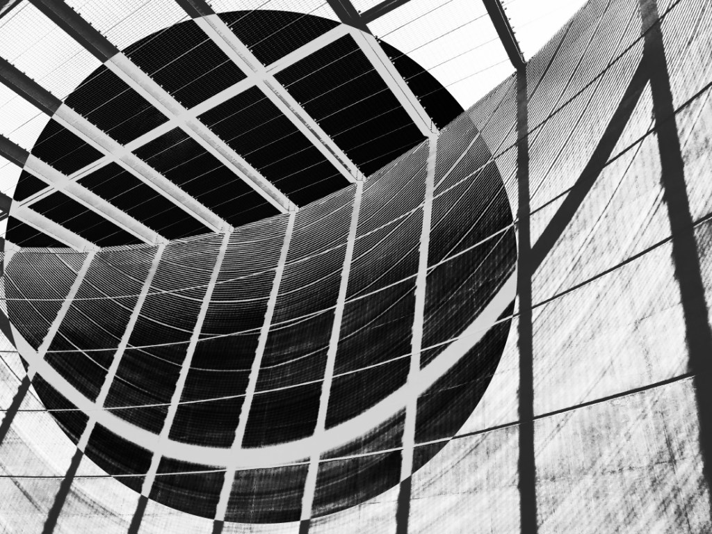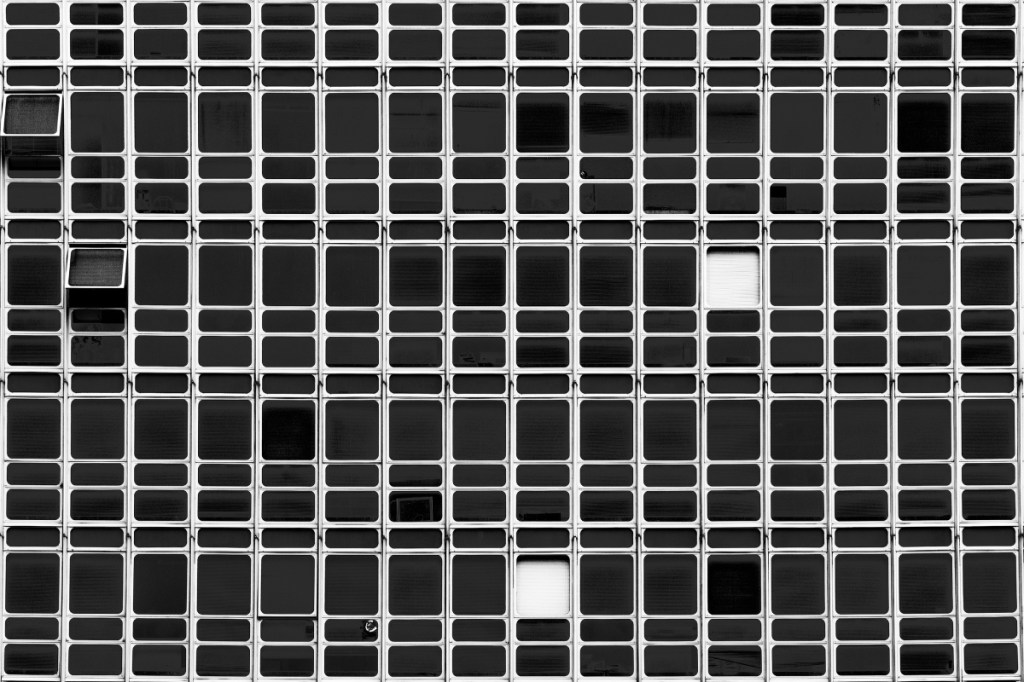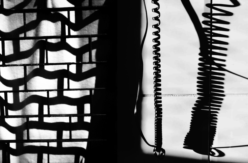 Black-and-white compositions examining intersections of lines, structural systems and interrupted patterns.
